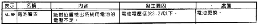 MR-J2S-100A-EG011會顯示AL.9F是由於電池警告(Battery warning)所造成的